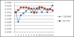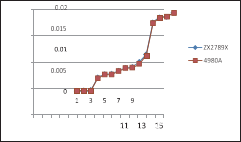 測試速度快了,還必須保證測量數(shù)據(jù)的穩(wěn)定性,左圖是兩種不同的 機型,大家都用各自的最快測試速度,掃描測試同一個網(wǎng)絡變壓器同一 個繞組的漏感15次的測量數(shù)據(jù)分布圖,我們可以看到,ZX2789的測量數(shù) 據(jù)的一致性要略好一些。